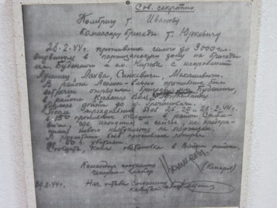 На фото – шифрограмма, переданная генерал-лейтенантом Комаровым (Коржом) с информацией об обстановке в районе нахождения бригады от 26 февраля 1944 г. (копия записки находится в музее боевой славы Озеричинской СШ)
