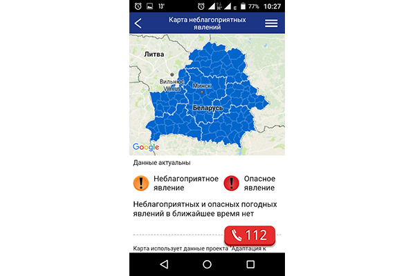 Для ўсіх гэтых функцый падключэнне для інтэрнэту неабавязковае. Адзіны раздзел, для якога ён патрэбны, – карта неспрыяльных з’яў. На смартфон прыйдзе паведамленне пра небяспечныя з’явы надвор’я. Яны ж будуць нанесены на інтэрактыўную карту. І з дапамогай усяго аднаго націску можна атрымаць інфармацыю пра тое, як дзейнічаць у небяспечнай сітуацыі.