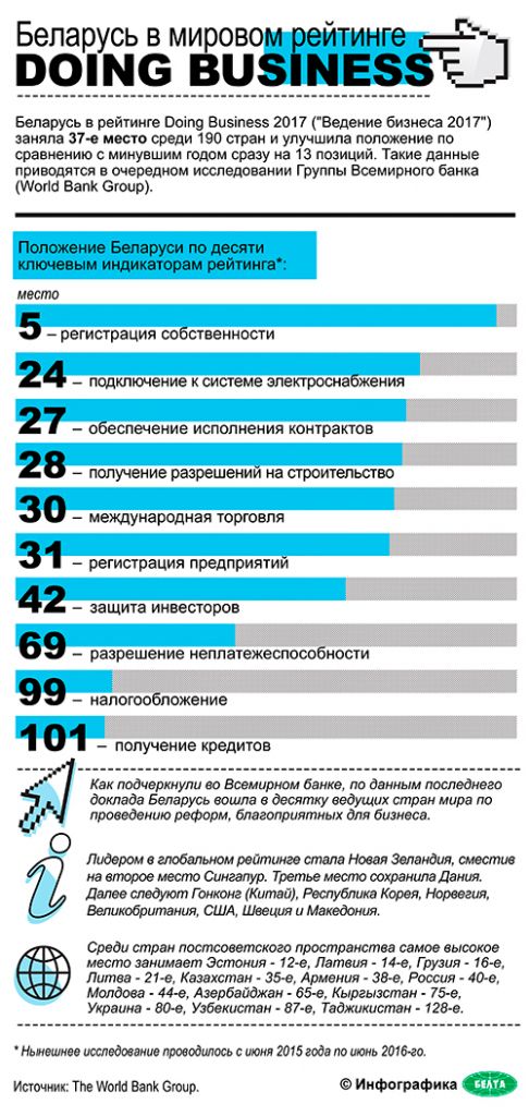 Еще десять лет назад в ежегодном отчете Всемирного банка наше место было ближе к аутсайдерам: Беларусь занимала 129-ю строчку из 175 возможных. Нынешний результат впечатляет: 37-е место из 190 государств мира. Это самая высокая позиция страны за минувшие годы. Более того, мы стали одним из ведущих в мире реформаторов и даже заняли пятое место по количеству преобразований во всех сферах предпринимательской деятельности.